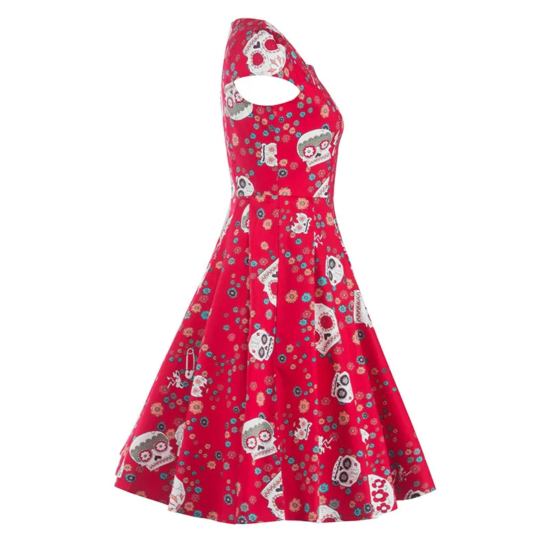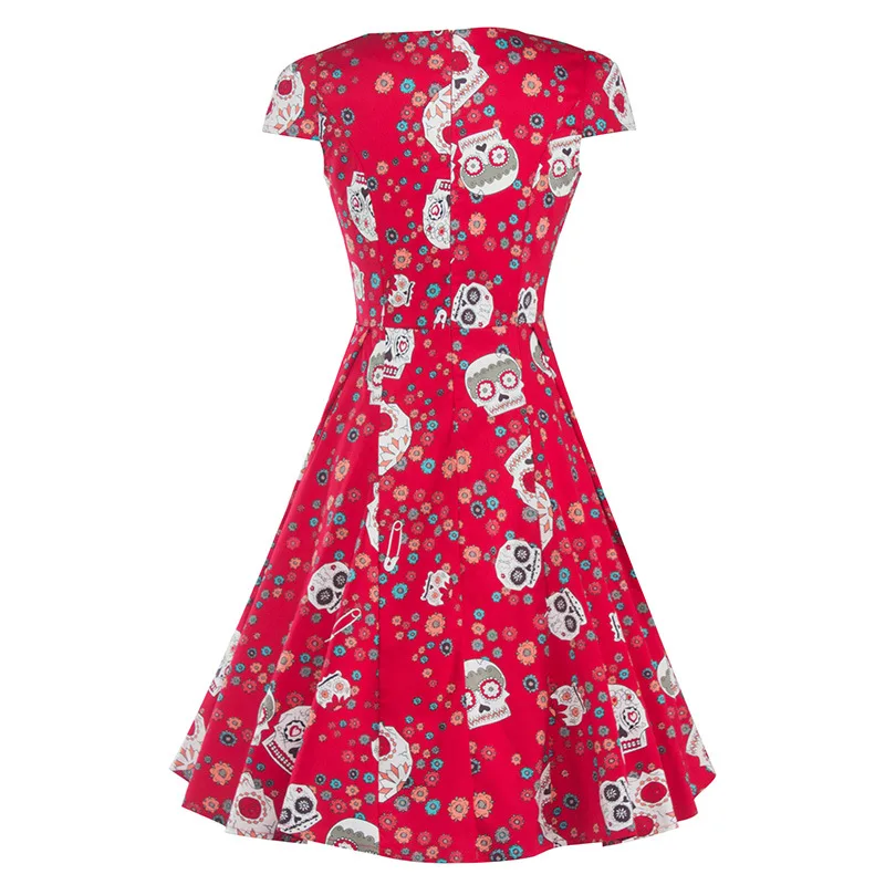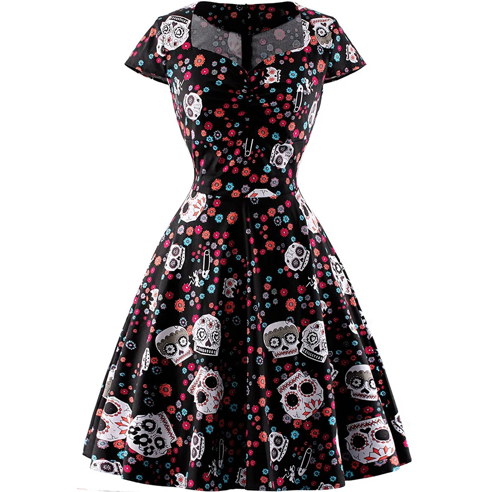 Купить IShine лето череп голова Печатный короткий рукав v образный вырез рокабилли платье женское 50 60 s pin up элегантное праздничное платье vestidos плюс ра... Цена Дешево