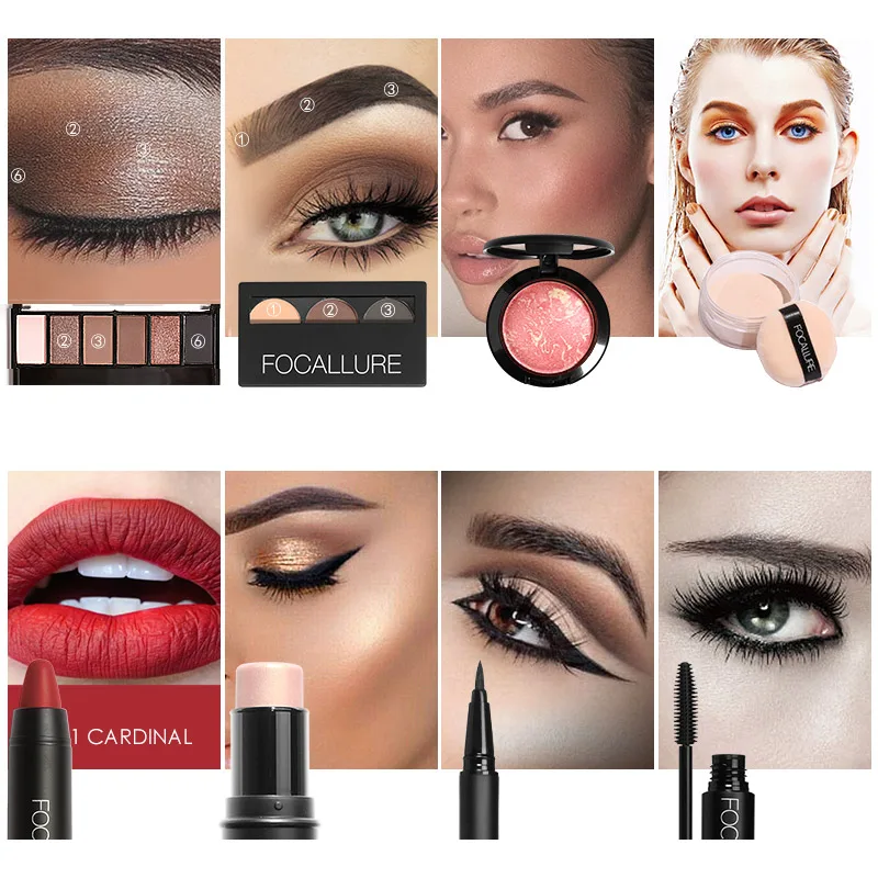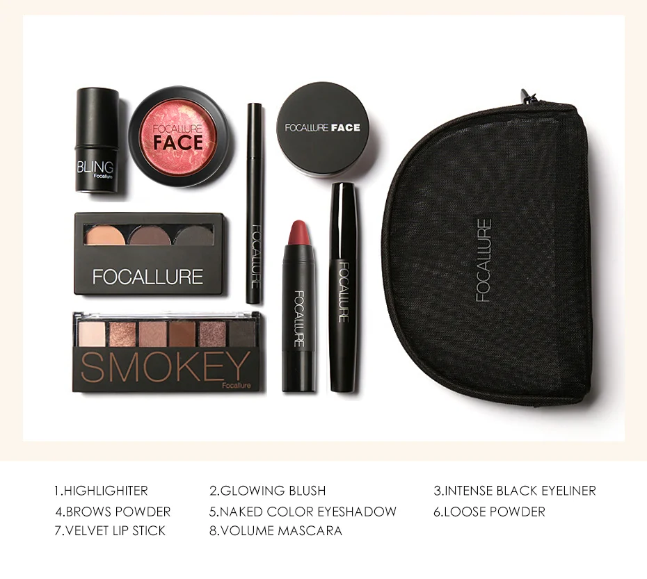 Купить Focallure 8 шт. компл. набор для макияжа, включая губную помаду, подводку для глаз, тушь для ресниц, тени для век, пудру для бровей, румяна, хайлайте... Продажа Дешево
