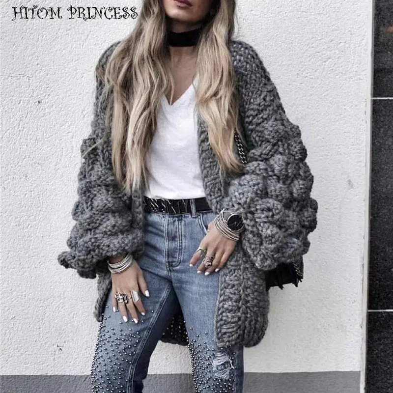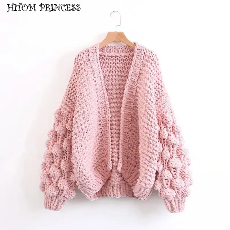 Купить HITOM фонарь для принцессы рукавом помпонами вязаные свитера Для женщин кардиган 2018 ручной работы теплые трикотажный джемпер oversize пальто Продажа Дешево.
