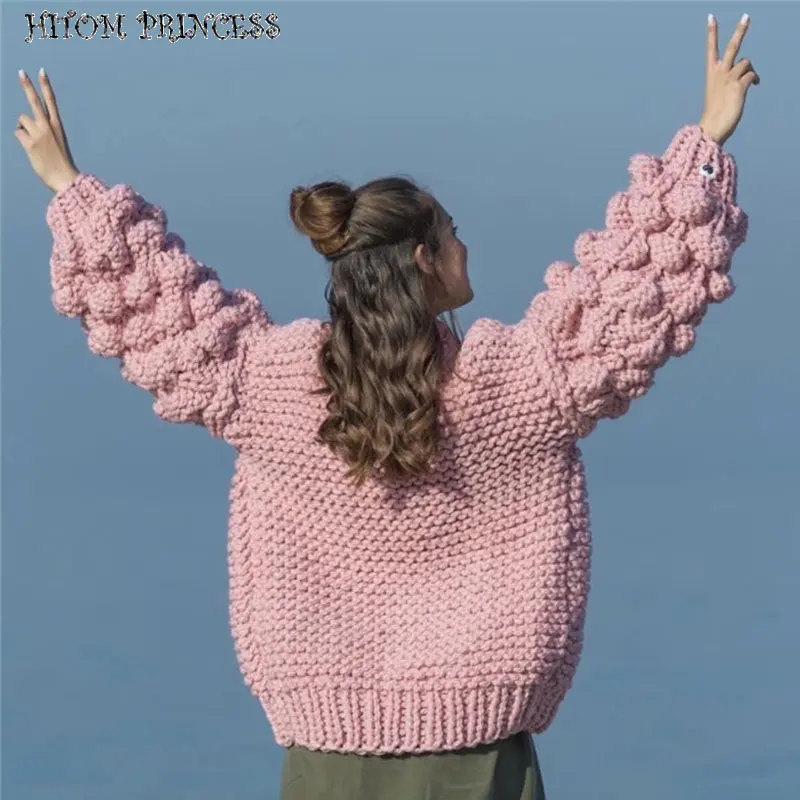 Купить HITOM фонарь для принцессы рукавом помпонами вязаные свитера Для женщин кардиган 2018 ручной работы теплые трикотажный джемпер oversize пальто Продажа Дешево