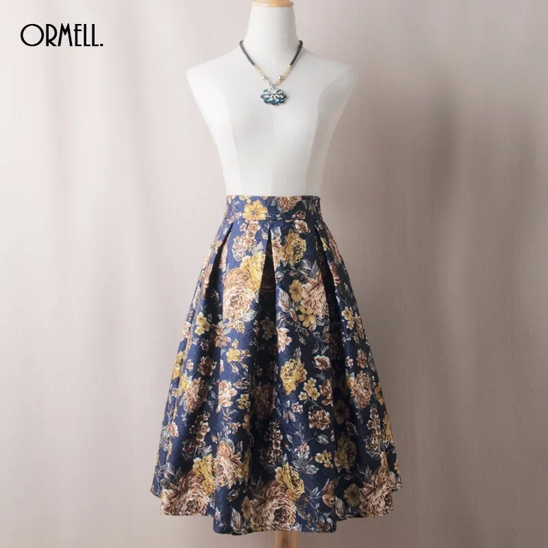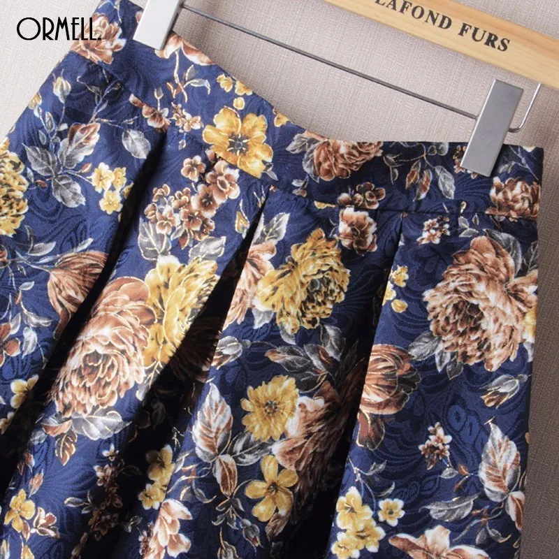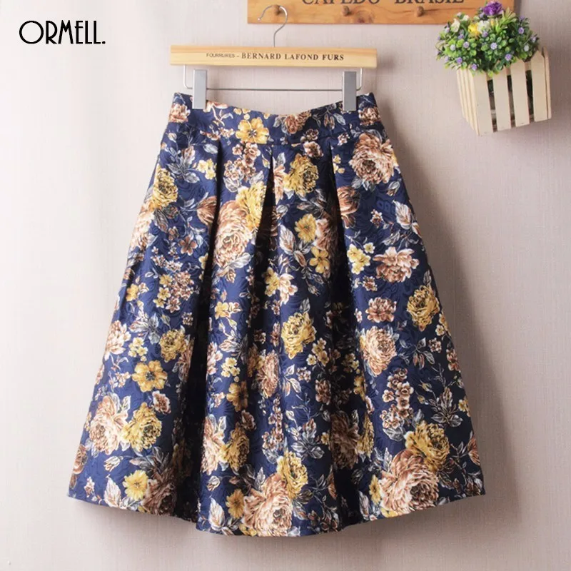 Купить Ormell 2017 Для женщин юбка Винтаж элегантный Цветочный принт Высокая Талия бальное платье женский плиссированные Миди юбки линия юбки солнце Продажа Дешево.