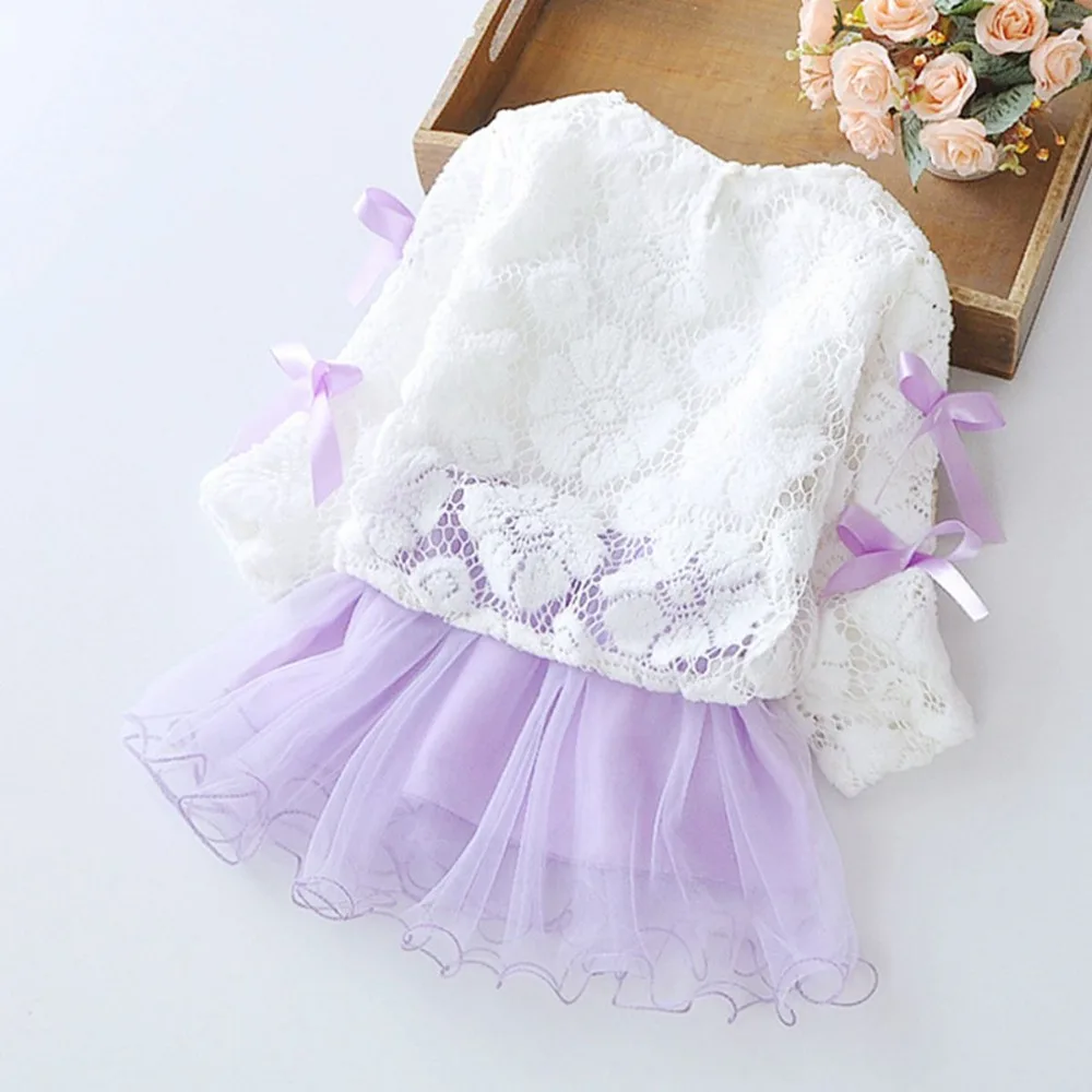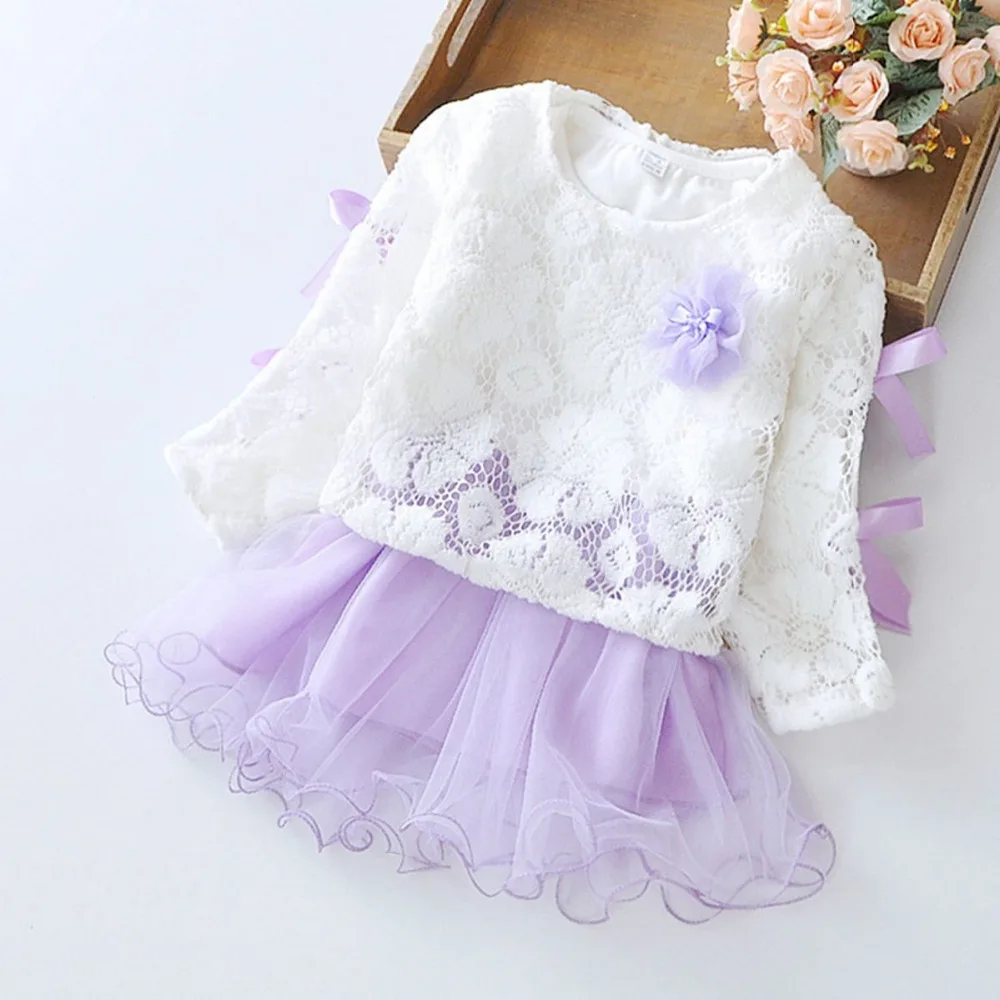 Купить Весна Длинные рукава цветок лук для маленьких Bebe для девочек кружевные топы + платья Двойка принцессы с юбкой пачкой платье для дня рождения... Цена Дешево