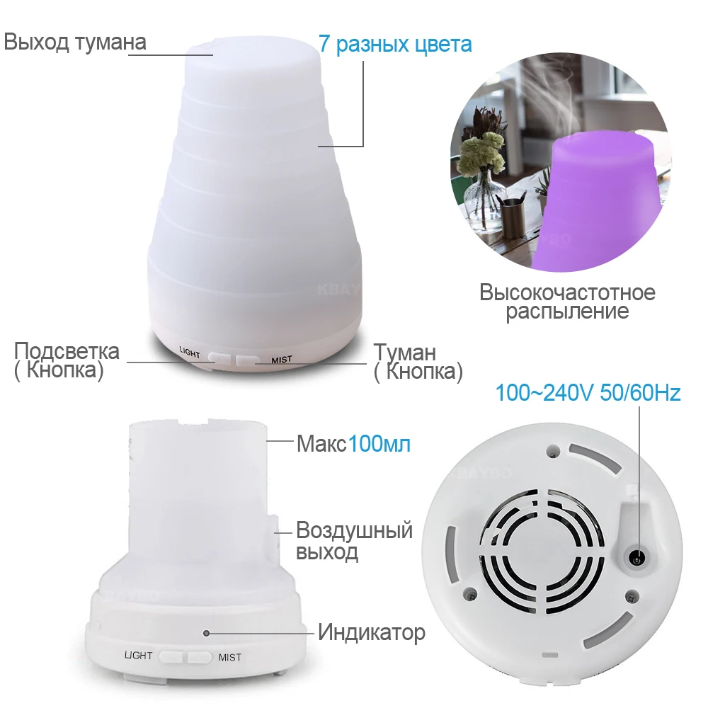 Купить KBAYBO 100 мл увлажнитель воздуха аромат эфирного масла диффузор Холодный Туман fogger 7 цветов светодиодные фонари Изменение для дома детские офи... Продажа Дешево