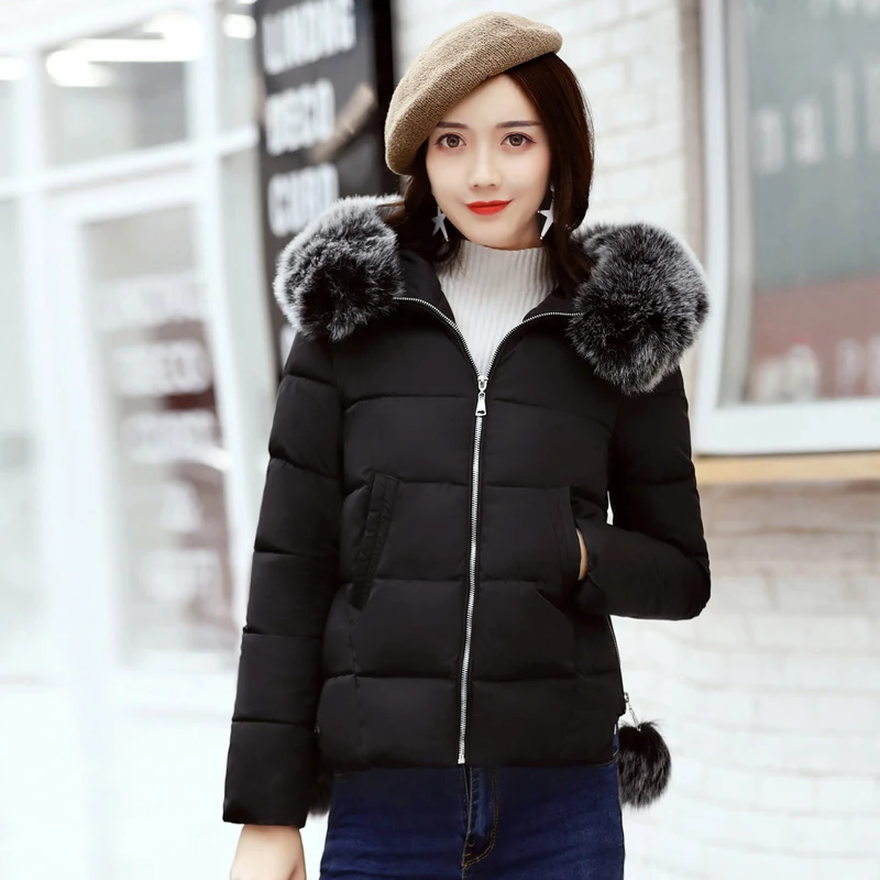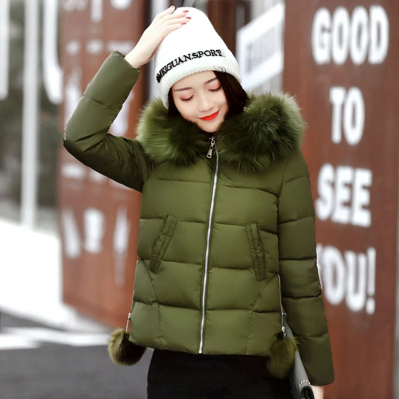 Купить 2018 Новое поступление зимняя куртка Для женщин с капюшоном с меховыми шариками женские пальто зимняя короткая парка с хлопковой подкладкой ... Продажа Дешево