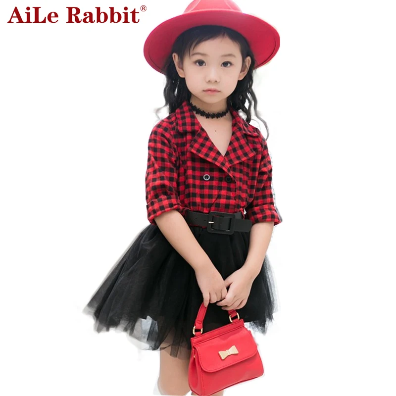 Купить AiLe Rabbit девочек платье пачка Демисезонный длинный рукав Детская одежда в клетку кружевное платье Детская одежда k1 Цена Дешево.
